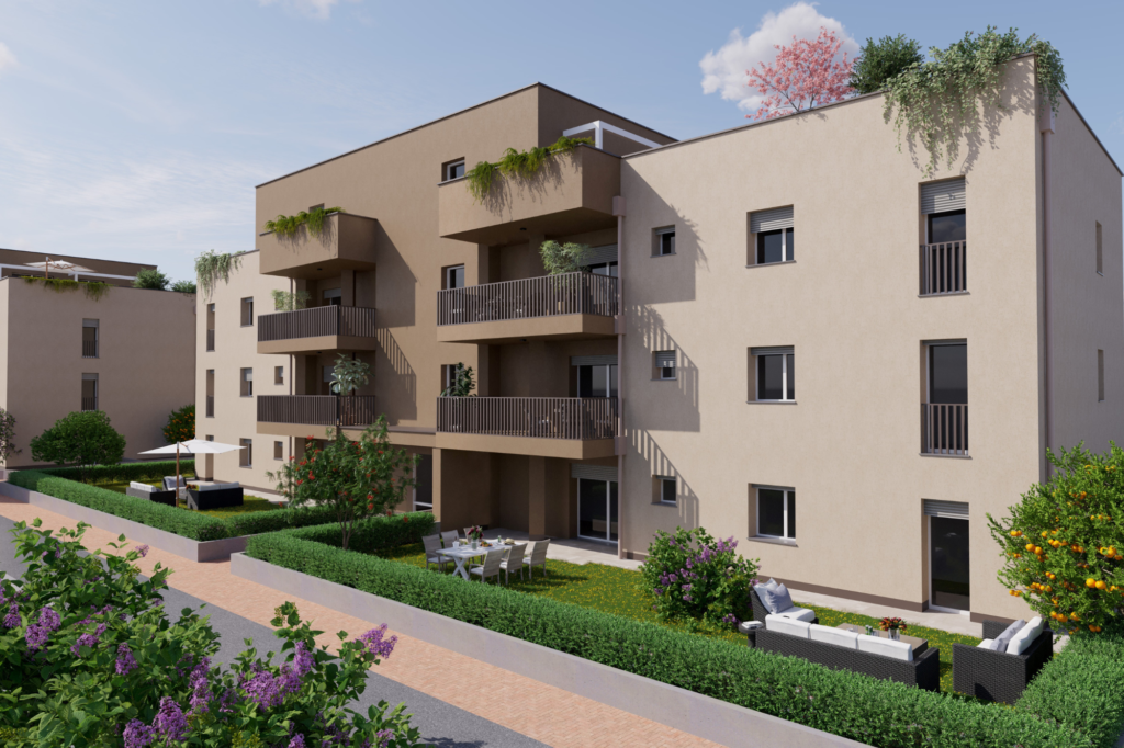 Gli appartamenti al piano terra sono arricchiti da giardini privati, perfetti per momenti di relax all’aria aperta.