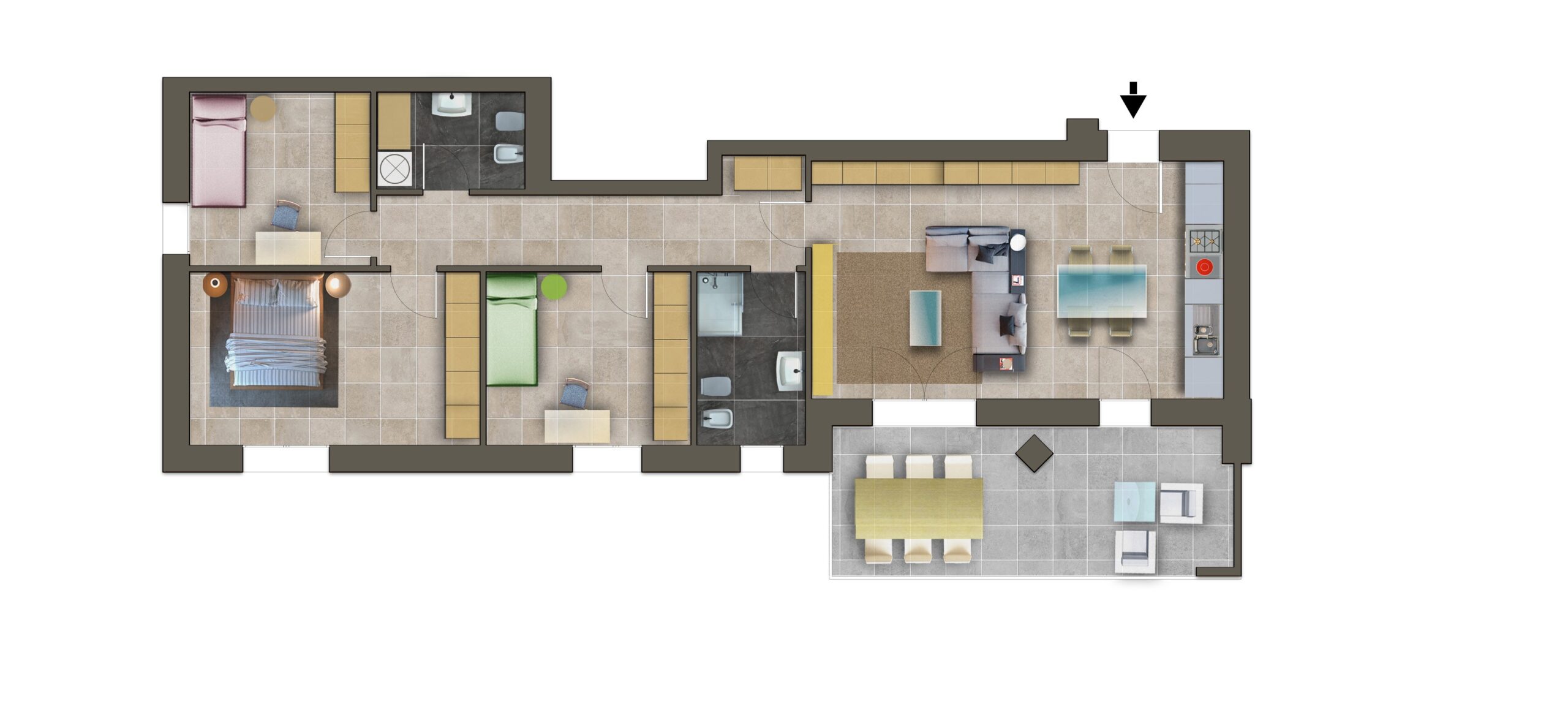 Appartamento quadrilocale di 112.4mq, con tre camere, doppi servizi, living con cucina open e terrazzo