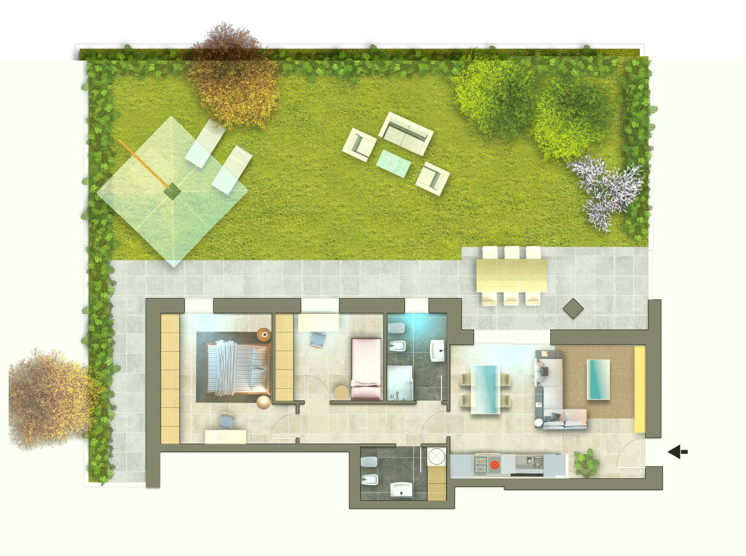 Appartamento trilocale di 91.7mq, con due camere, doppi servizi, living con cucina open e giardino