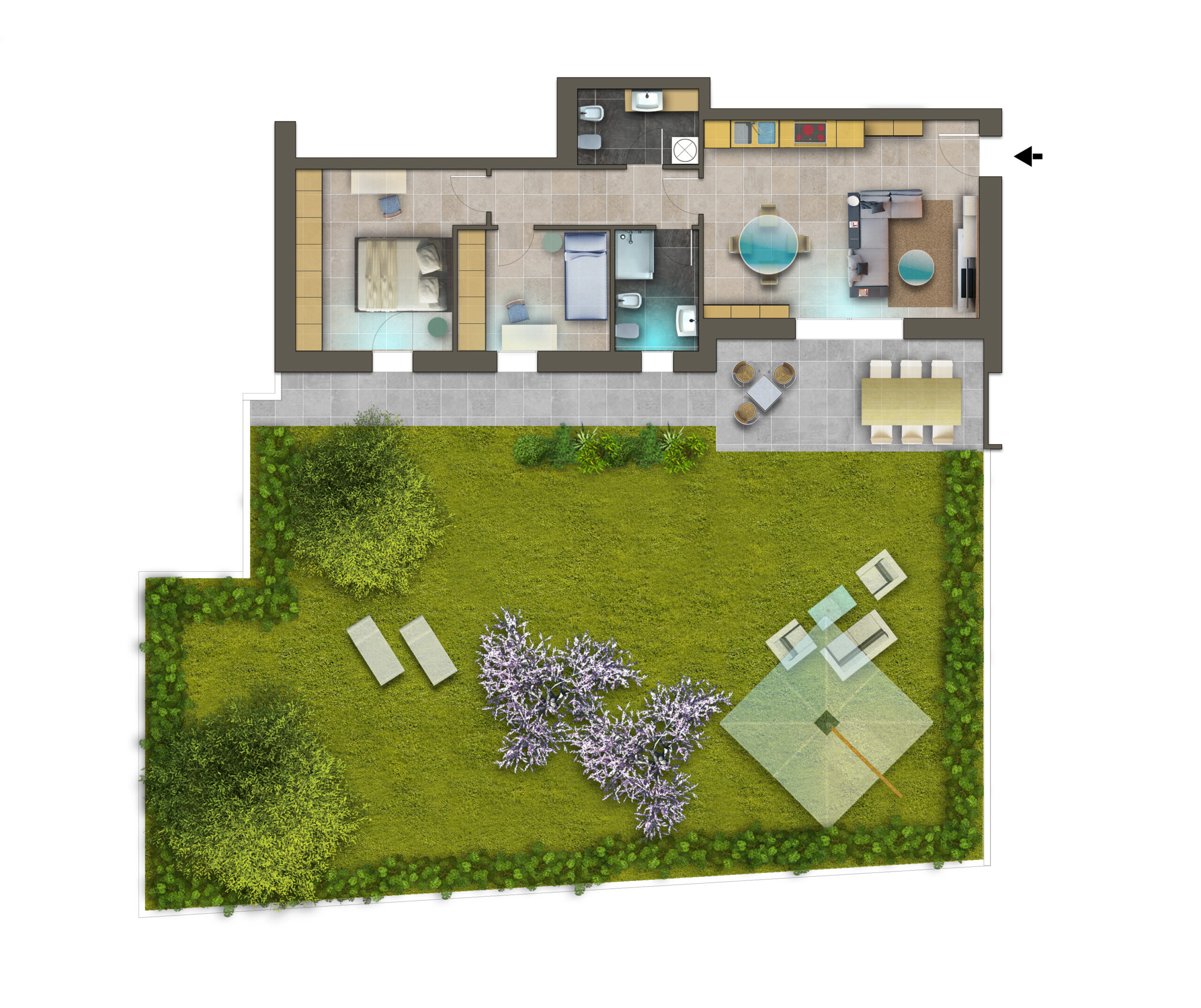 Appartamento trilocale di 91.9mq, con due camere, doppi servizi, living con cucina open e giardino