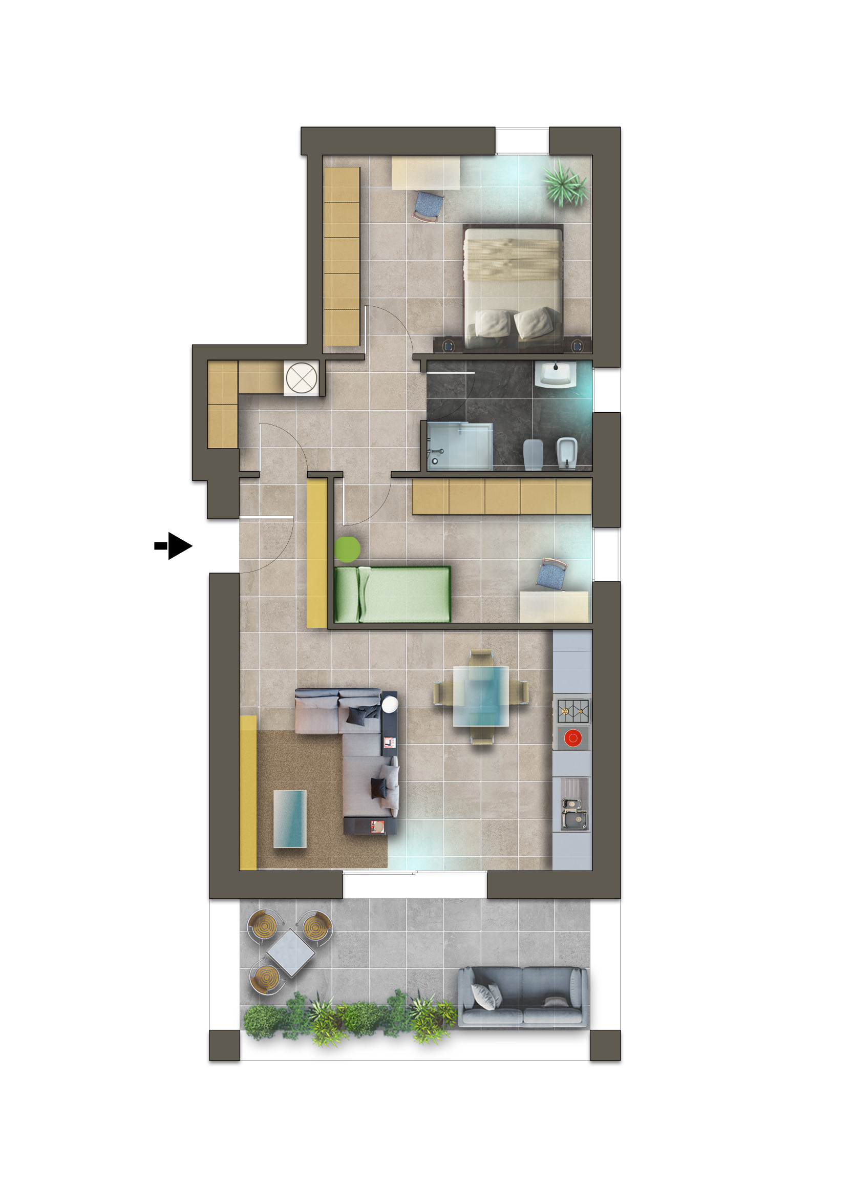 Puoi scegliere tra trilocali (con 2 camere, 2 bagni e terrazzo) e quadrilocali (con 3 camere, 2 bagni e terrazzo) e attici tutti con ampi ampi e luminosi soggiorni che possano ospitare cucine ad isola. Nei quadrilocali la cucina può essere separata dal soggiorno.