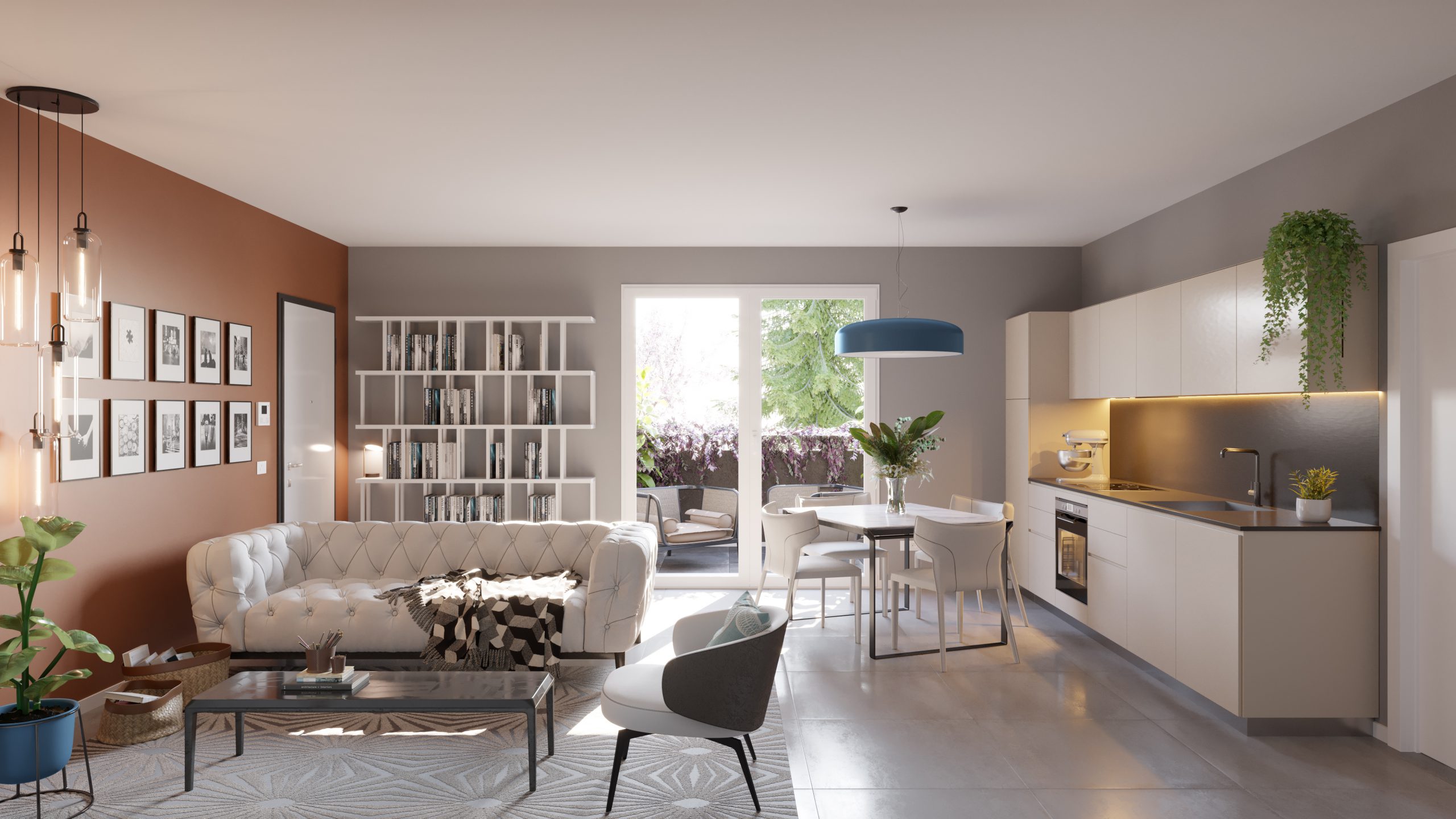 Appartamenti trilocali (con 2 camera da letto) e quadrilocali (con 3 camere da letto) sia al piano terra con giardini privati, sia ai piani più alti con terrazzi spaziosi.
