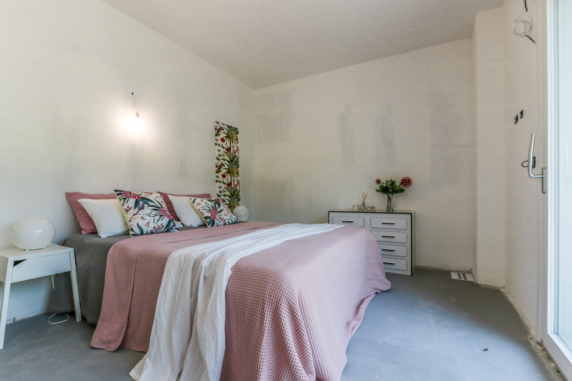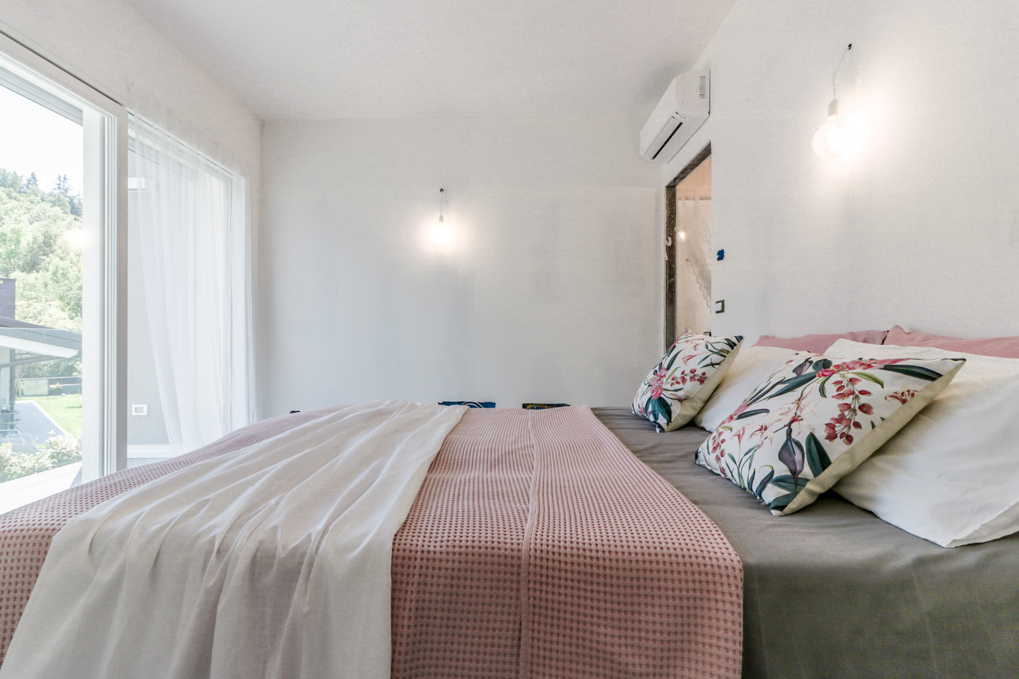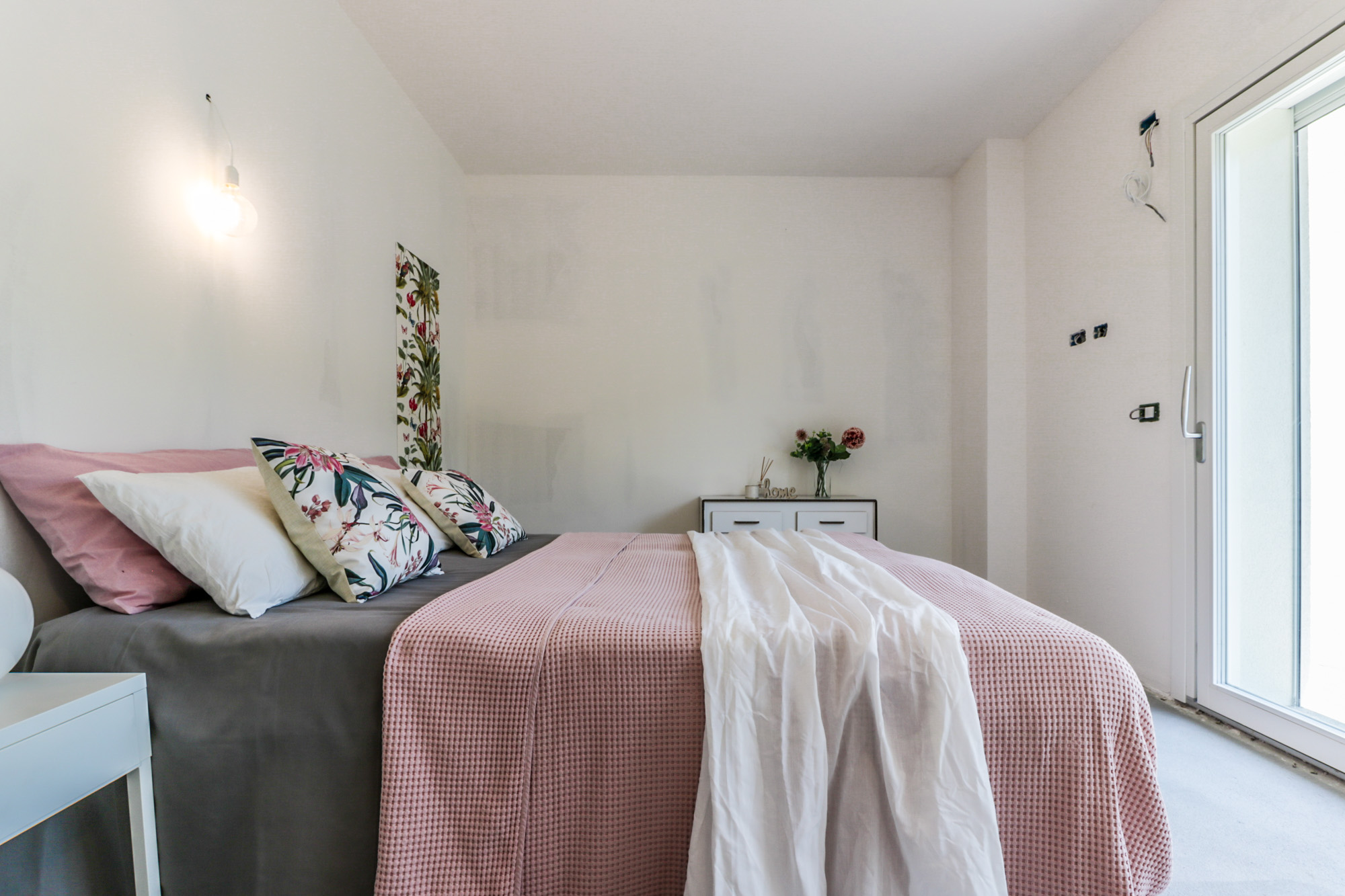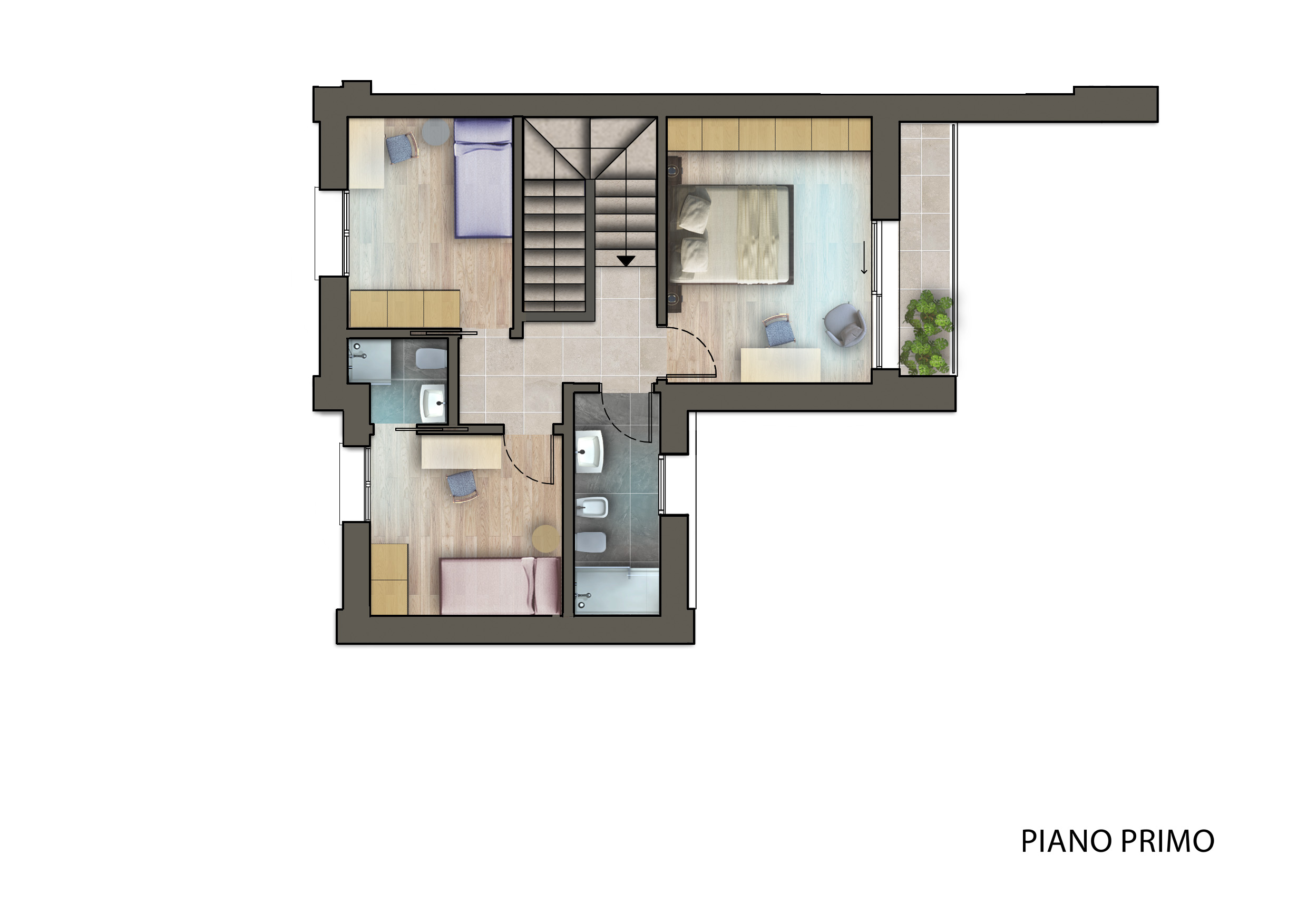 Il piano superiore presenta la zona notte con tre camere da letto. La camera matrimoniale ha un balcone privato per godere dell’aria fresca e la vista sul giardino. Due camere singole, di cui una può essere adibita a studio o stanza per gli ospiti. I due bagni completano il piano.