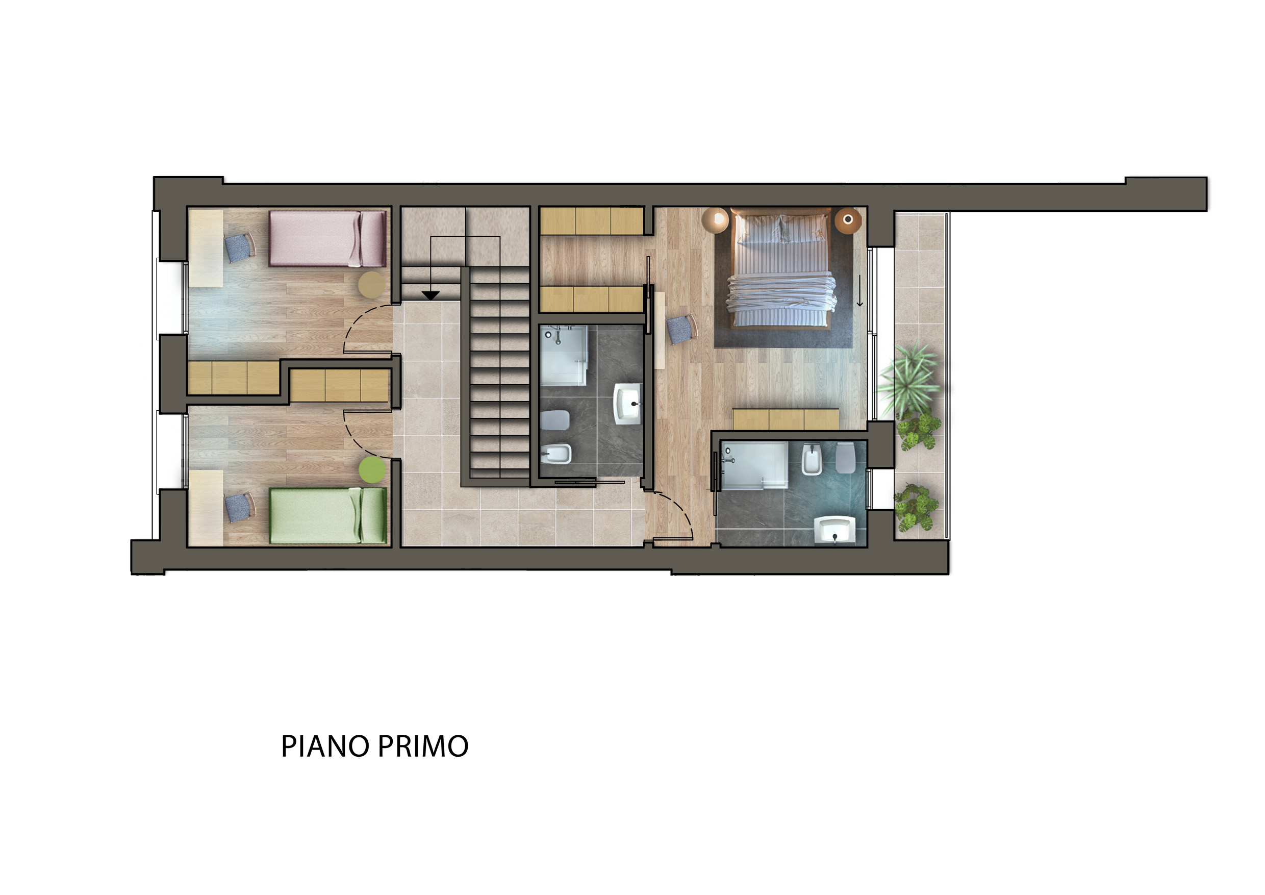 Il piano superiore ospita una vera e propria suite matrimoniale con cabina armadio e bagno privato, oltre balcone privato con vista sul giardino. Due camere singole, di cui una può essere adibita a studio o stanza per gli ospiti, e un ulteriore bagno al secondo piano.