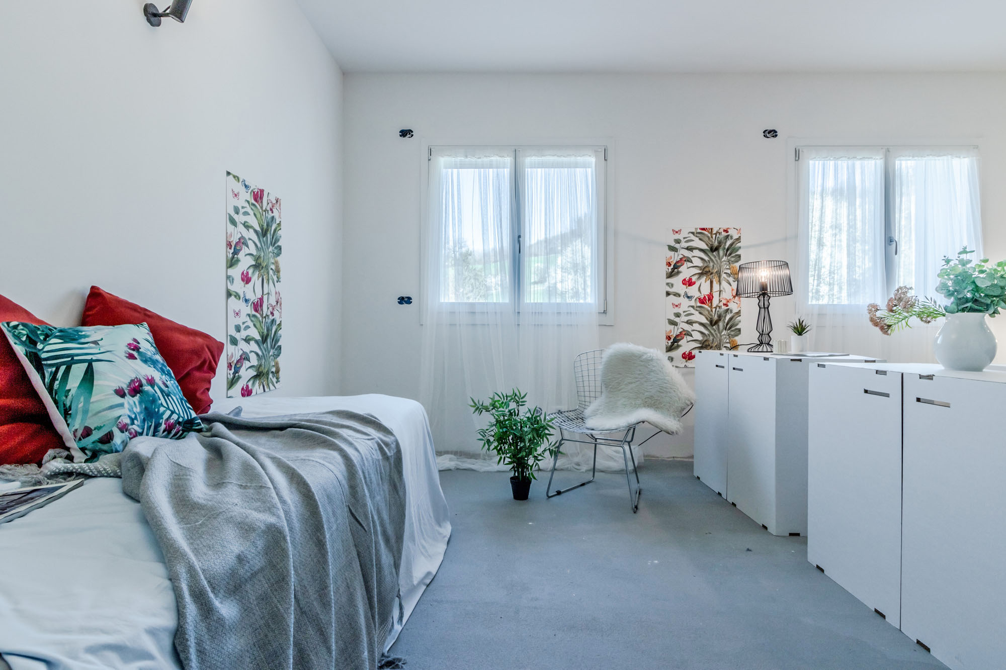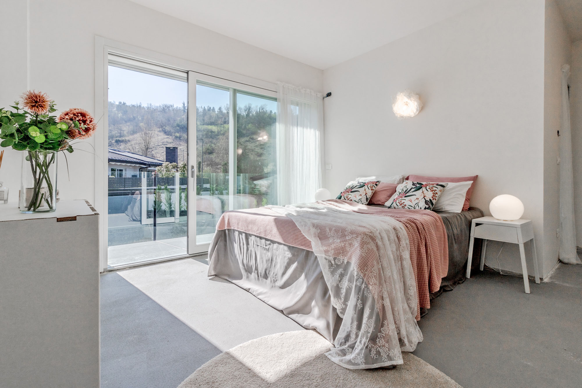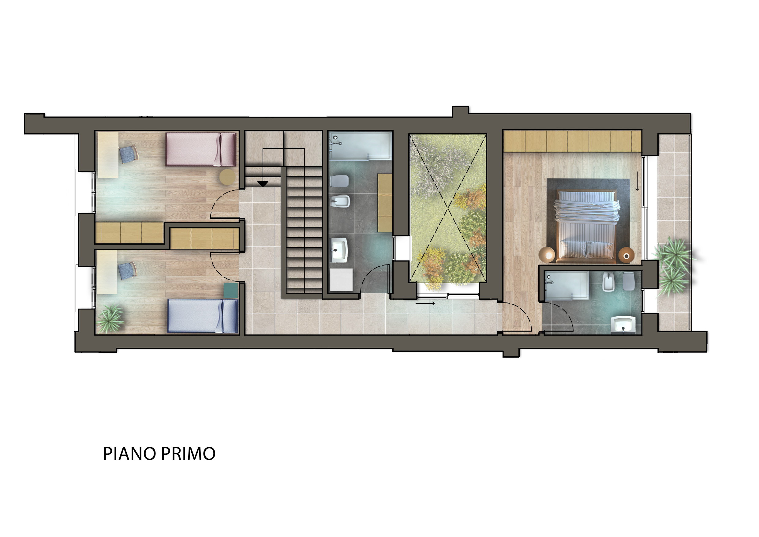 Il piano superiore ospita la zona notte con tre camere da letto. La camera matrimoniale con balcone privato e bagno finestrato regala uno spazio intimo e confortevole per il tuo relax. Le due camere singole offrono spazio extra per i familiari o per gli ospiti. Un ulteriore bagno completa il secondo piano.