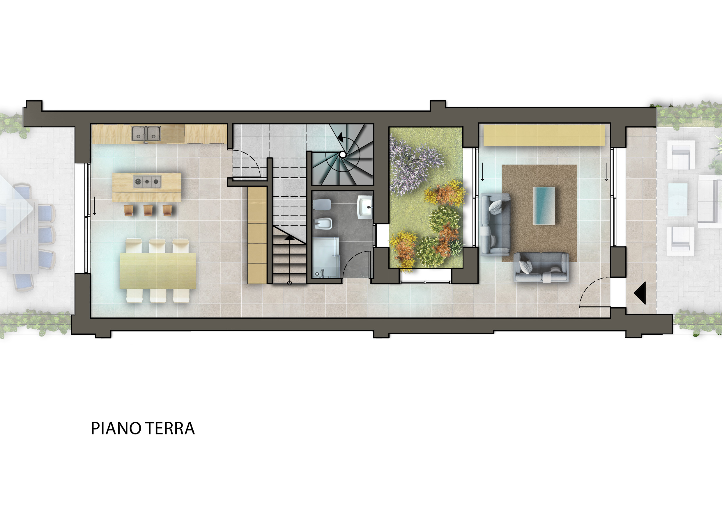 La villetta è immersa in due giardini privati, offrendo momenti di relax all’aria aperta. Essere parte di un esclusivo contesto residenziale si soli 5 immobili garantisce sia l’autonomia abitativa che una maggiore sicurezza.