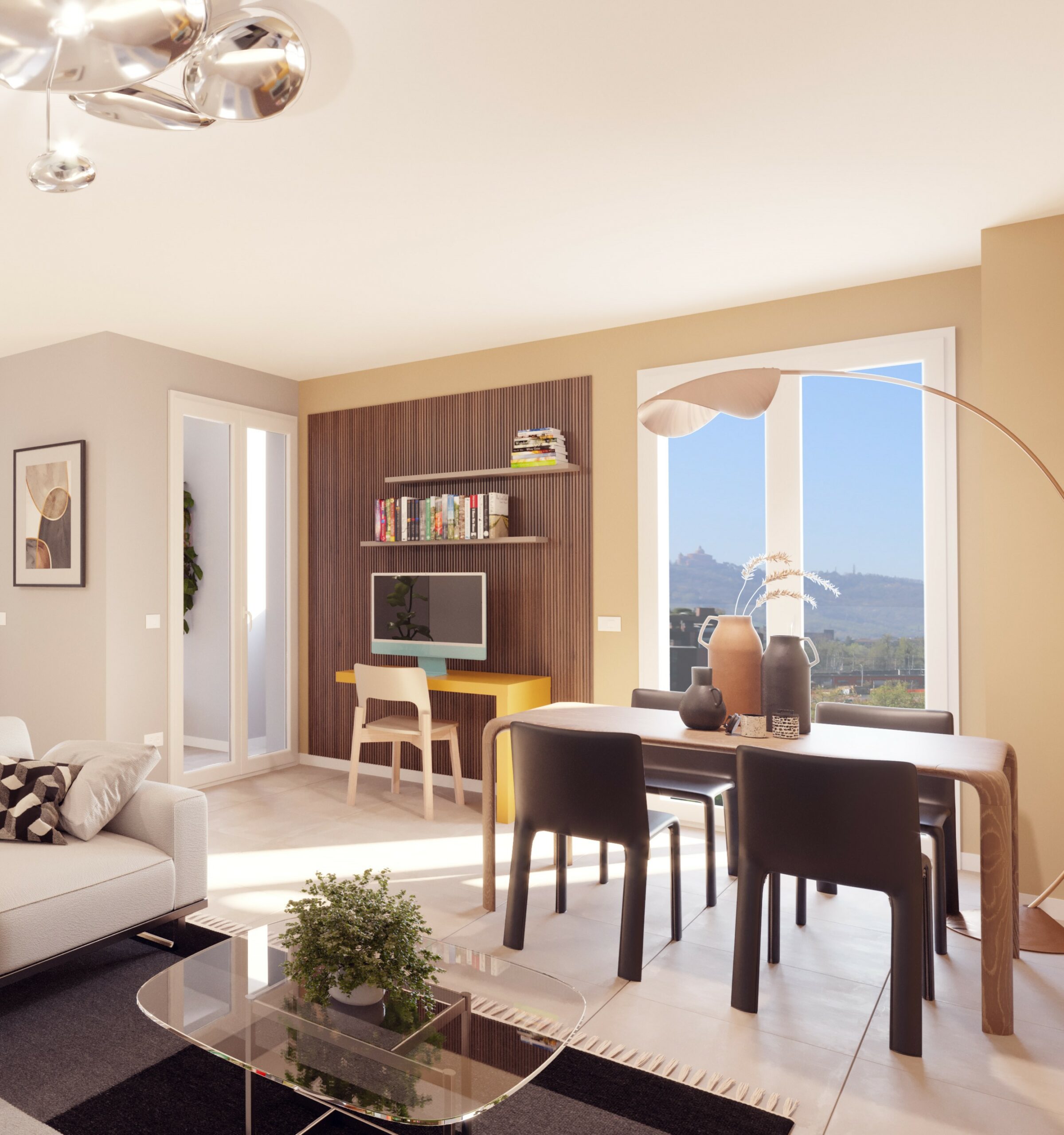 Il soggiorno, inondato di luce naturale grazie alle ampie vetrate, si affaccia su una terrazza panoramica che offre una vista incantevole dal parco fino alle colline bolognesi e al Santuario di San Luca. La zona giorno è ben separata tra un ampio soggiorno e una cucina.