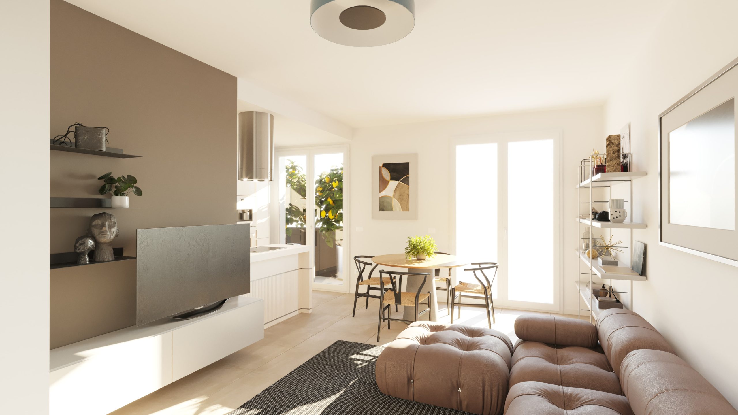 Questo bilocale smart, ideale per single, giovani coppie o per investimento, possiede un luminoso living che diventa il cuore della casa.